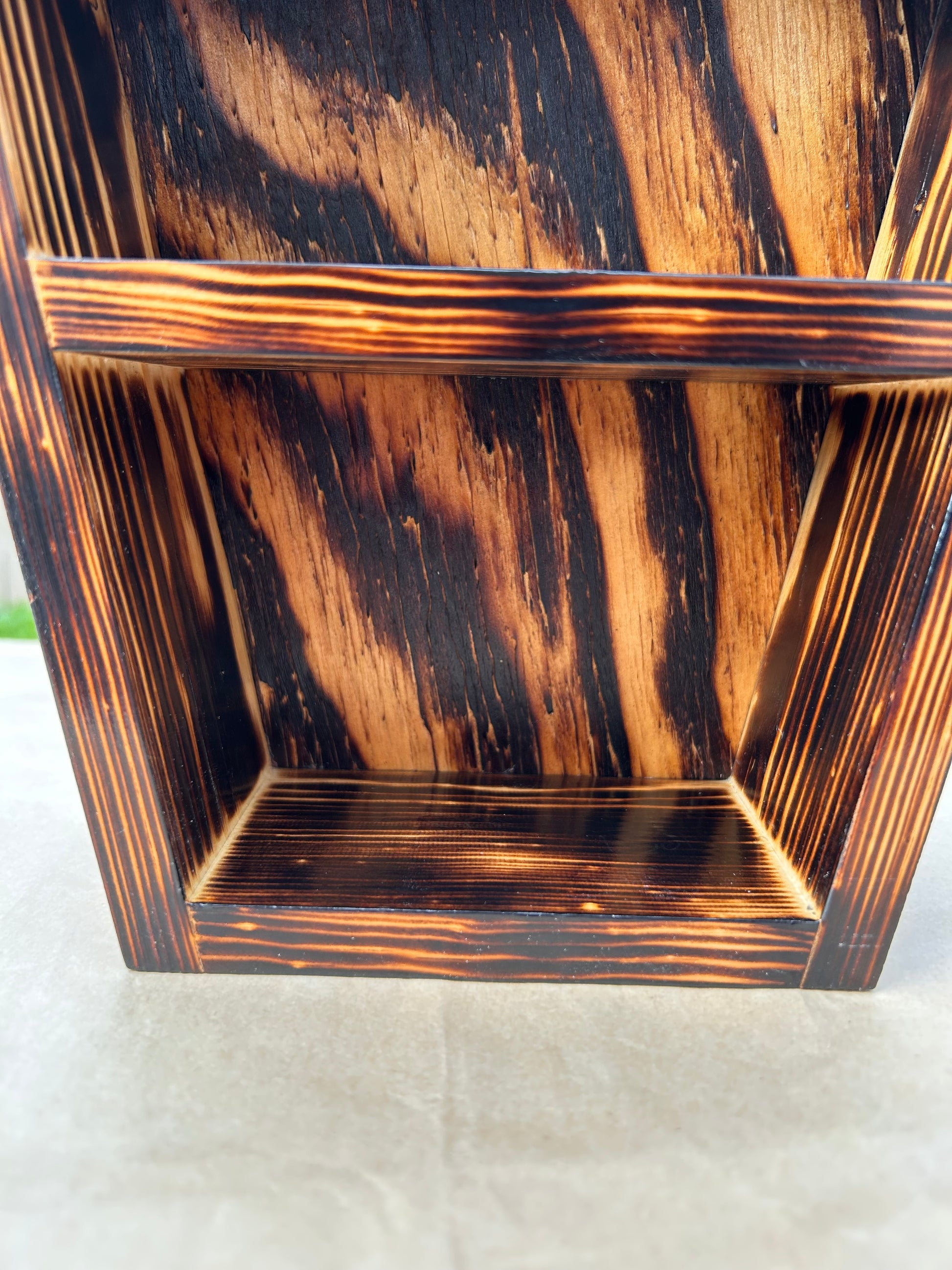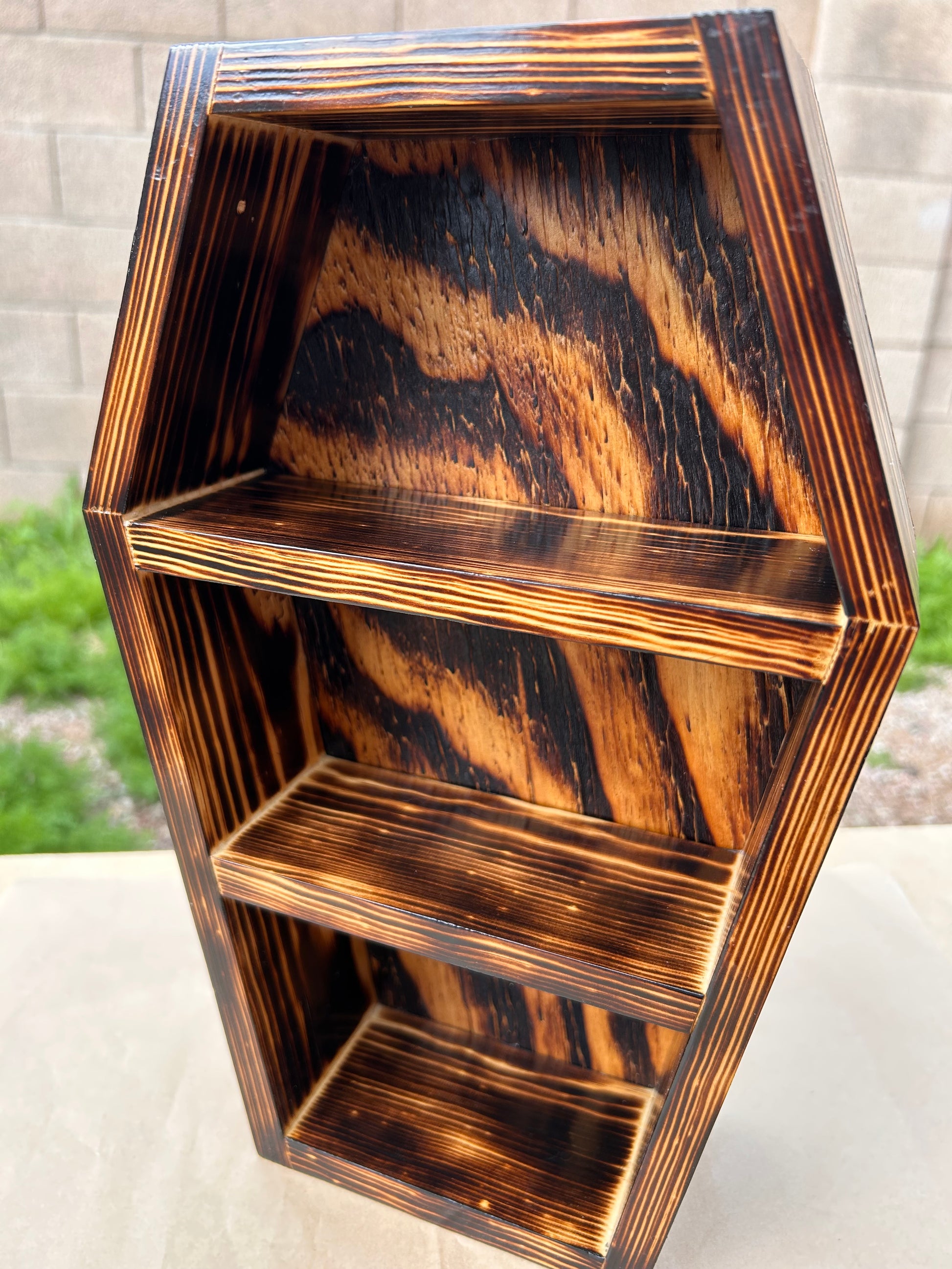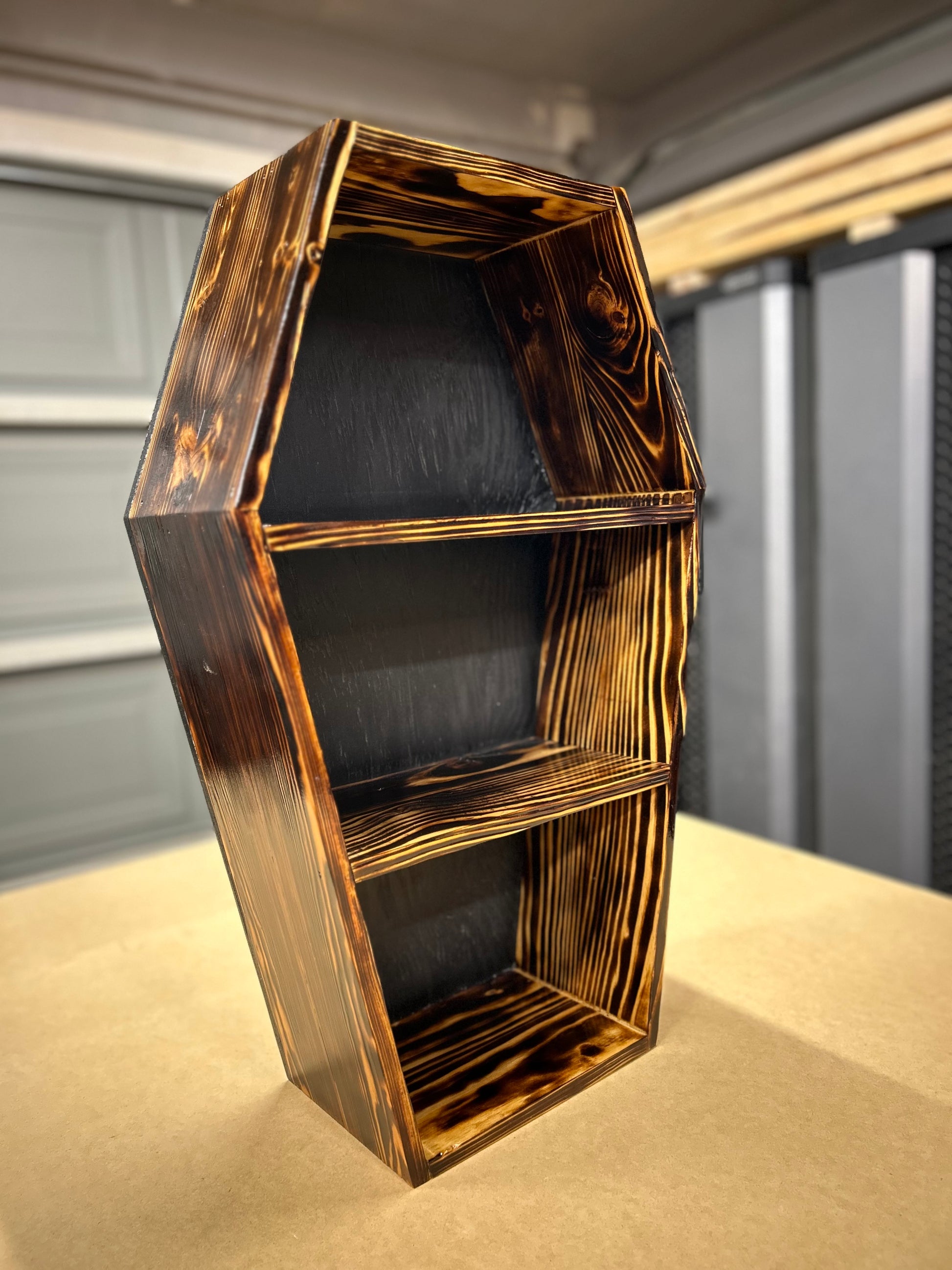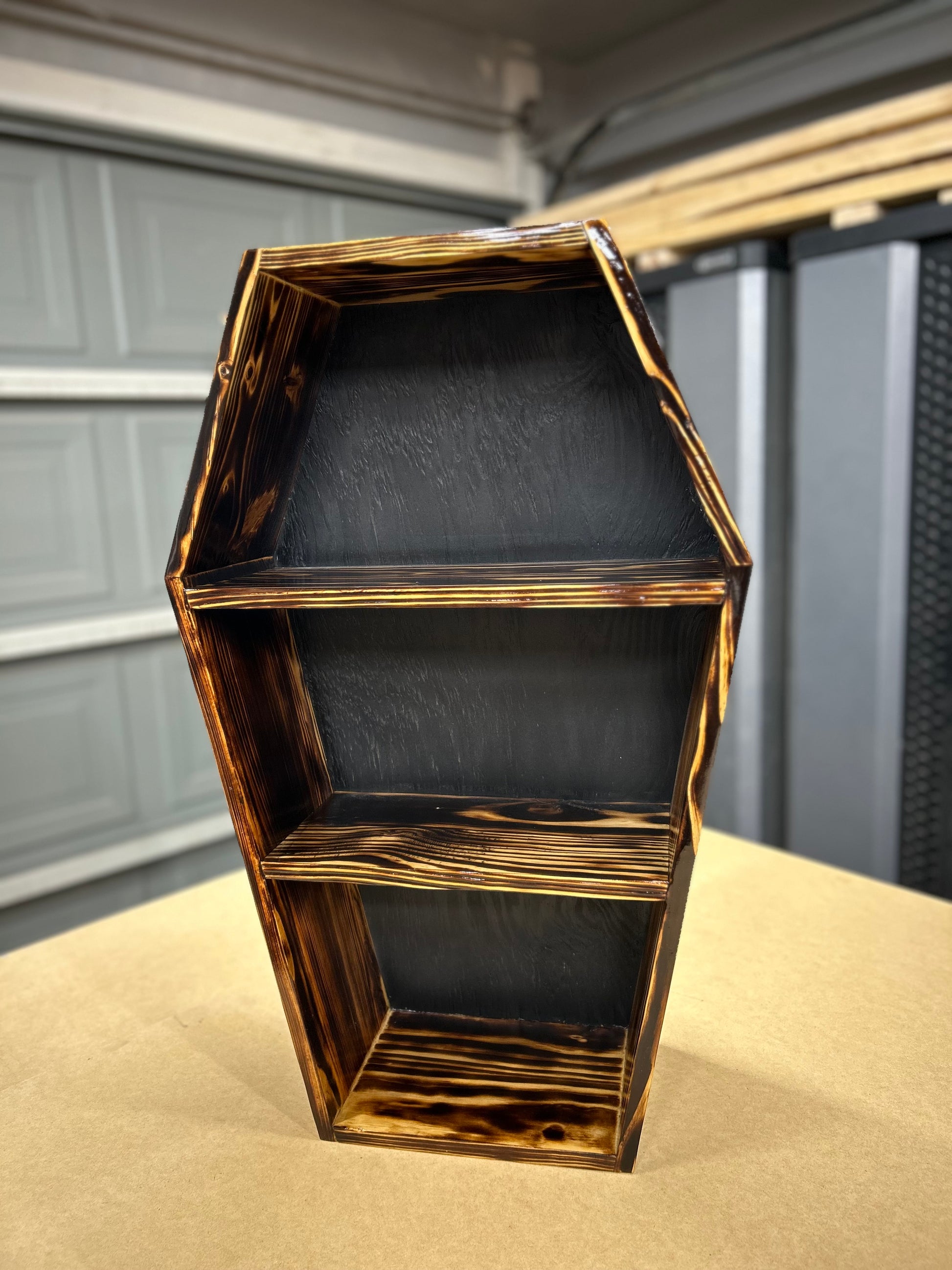 Handmade Wooden Coffin Shelf - Torched/Burned and Clear Coated as desired.